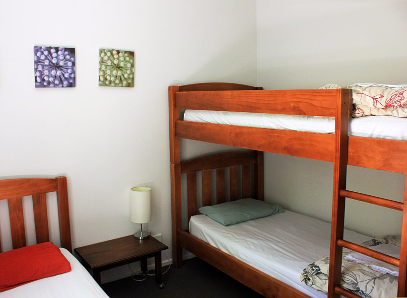 Spacious 3 Bed SHARE Bunk Room (3 persons per room) with shared bathroom. Full bed linen and innerspring mattresses.
